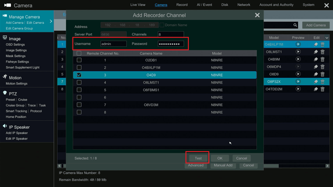 - Enter in the correct credentials for the recorder and hit Test to reveal the camera names of the recorder and verify the credentials are correct