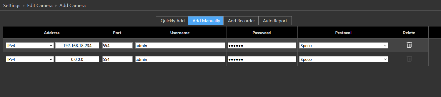 Step 2: Go to Camera > Add Camera > Add Manually. Enter the IP address, username and password.