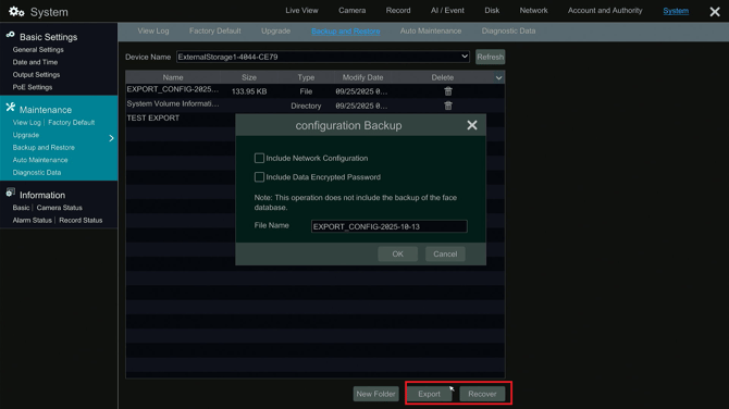 Note: Restoring or backing up will only work with the same model recorder and same firmware version