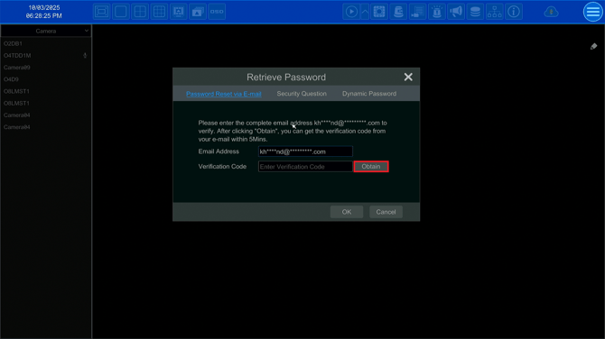 - Enter the email address you set up under Password Recovery Settings, Click Obtain