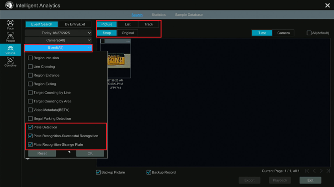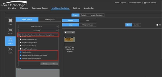 - Clicking search will bring up any LPR as well as vehicles detected. Plate detection as a successful recognition or a strange plate can be specified.