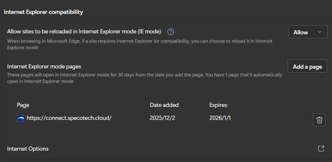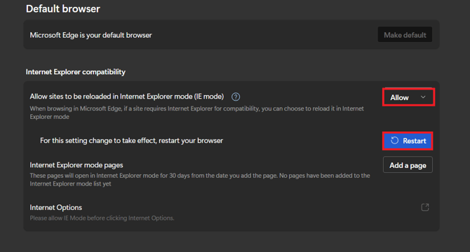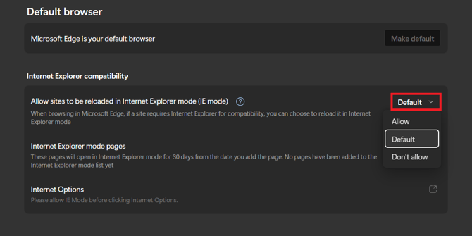 - Change the dropdown of “Allow sites to be reloaded in Internet Explorer mode (IE mode)” from Default to Allow.