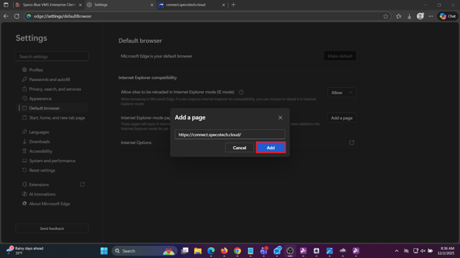 - Copy and paste the URL of the website or IP address of the camera/recorder you need to load in IE mode and click Add