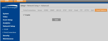In the event the cloud-enabled camera is intended only for local recording, the entire communication process to Speco Cloud can be disabled from Settings menu (Settings->Network Setup->Ports/Connections->Cloud Platform, uncheck Enable (see image).