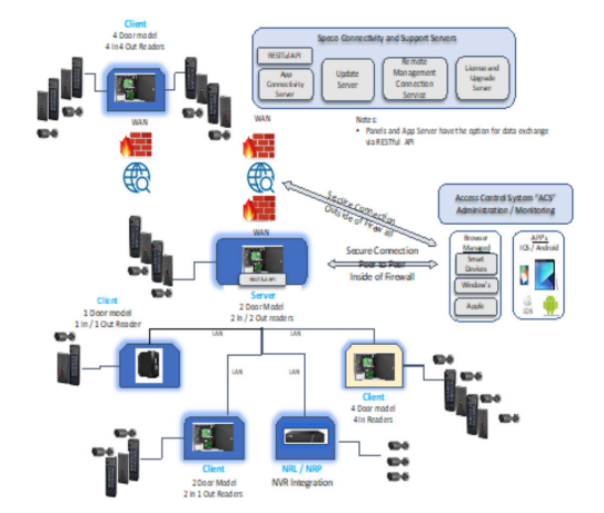 Our controller is an embedded, browser managed network appliance that is designed to support physical security of a facilities via a fast and intuitive embedded HTML5 web interface it’s primary use is to inform control who, what, where and when access events occur . The system manages any physical device that the system designer chooses to control such as door locking hardware, device management such as fans, pumps, pullies …. In addition the system is designed to monitor and inform the status of these devices. The hardware and software are configured and managed over a network using most internet browsers. The system can manage 60 transactions per second, using its Quad Core processor with 64 Bit processing. Speco offers additional system configurations that supports up to 120 transactions per second with significant system capacities for scaling options.